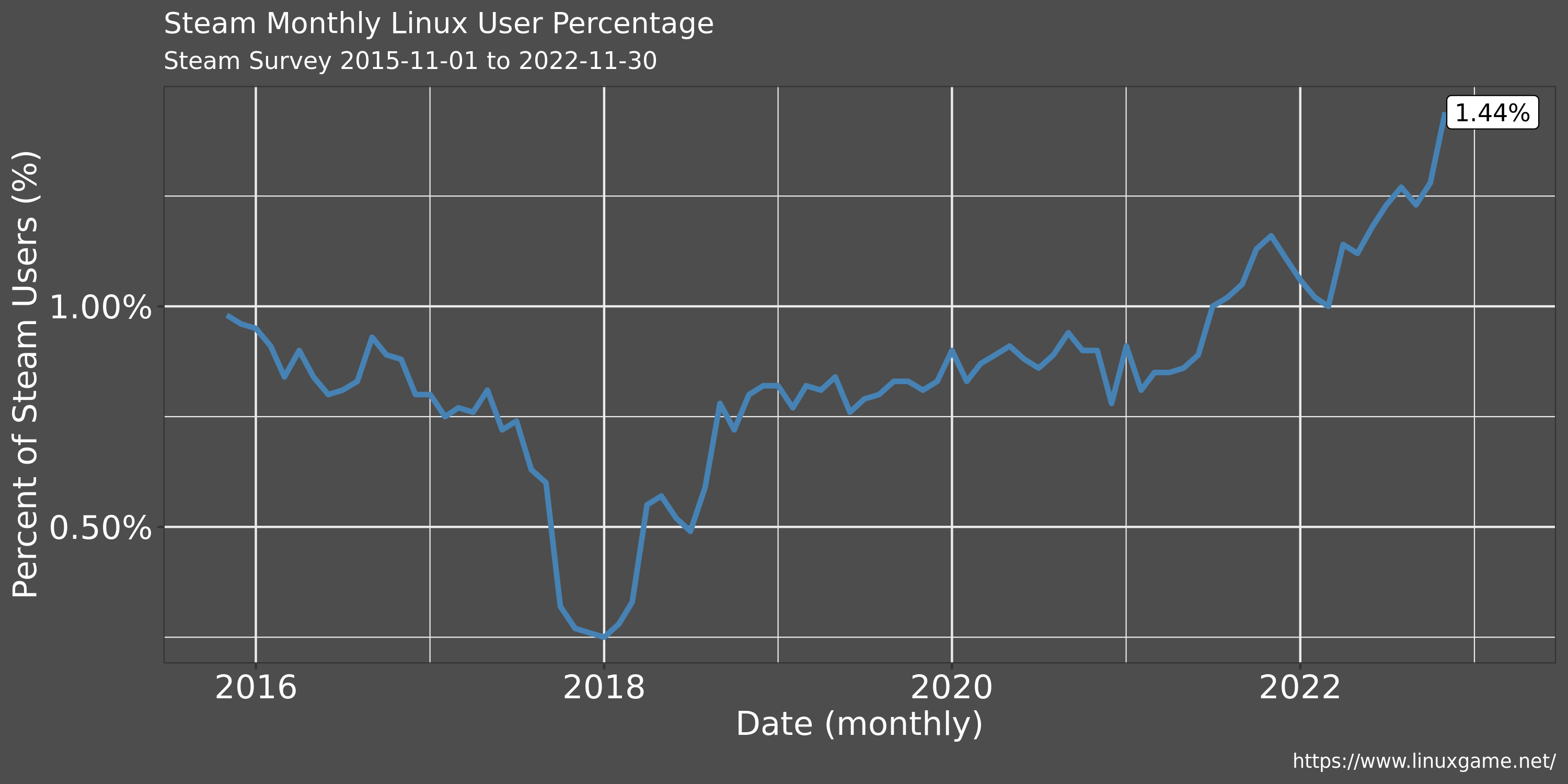 We scrape and save the results of each survey to display on our Linux Usage Statistics page. In November, Linux share on Steam increased by .16 percentage points to now sit at 1.44% of all users. That works out to nearly 2 million Linux gamers last month, using Steam's 2021 monthly active user count of 132 million. Considering Steam continued to break peak active users in 2022, I can only assume the number of Linux players has increased as well.